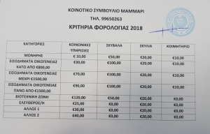 Σας ενημερώνουμε ότι οι φορολογίες που επιβλήθηκαν για τη χρονιά 2018 είναι βασισμένες σε κάποια κριτήρια. Σε περίπτωση που ο λογαριασμός σας έχει λανθασμένες χρεώσεις λόγω του ότι το Κοινοτικό Συμβούλιο Μάμμαρι δεν γνωρίζει επαρκώς τα εισοδήματα κάθε οικογένειας, παρακαλείστε όπως ελέγξετε τις χρεώσεις σας με βάση τα κριτήρια που έχουν ήδη αναρτηθεί. Όπου εντοπιστεί διαφορά, μπορείτε να επι κοιν ωνήσετε με το Κοινοτικό Συμβούλιο για να γίνουν οι διορθώσεις προσκομίζοντας τα απαραίτητα δικαιολογητικά.