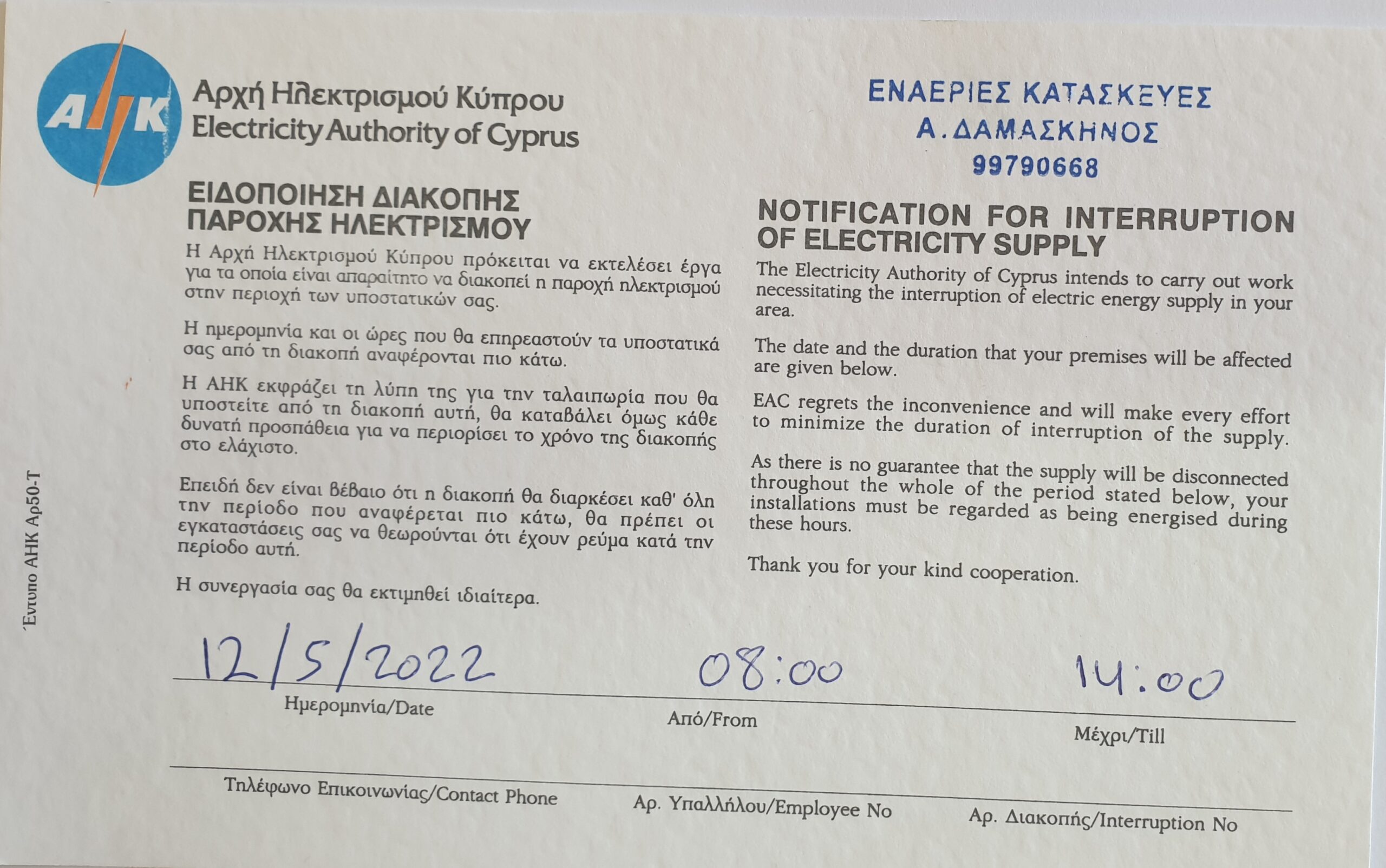 Την Πέμπτη 12 Μαΐου 2022 από η ώρα 8.00πμ μέχρι τις 2.00μμ θα υπάρξει διακοπή στην παροχή ηλεκτρισμού στο κάτω μέρος της κοινότητας αλλά και σε ορισμένες οδούς στην πάνω περιοχή της κοινότητας οι οποίοι θα ενημερωθούν προσωπικά.
