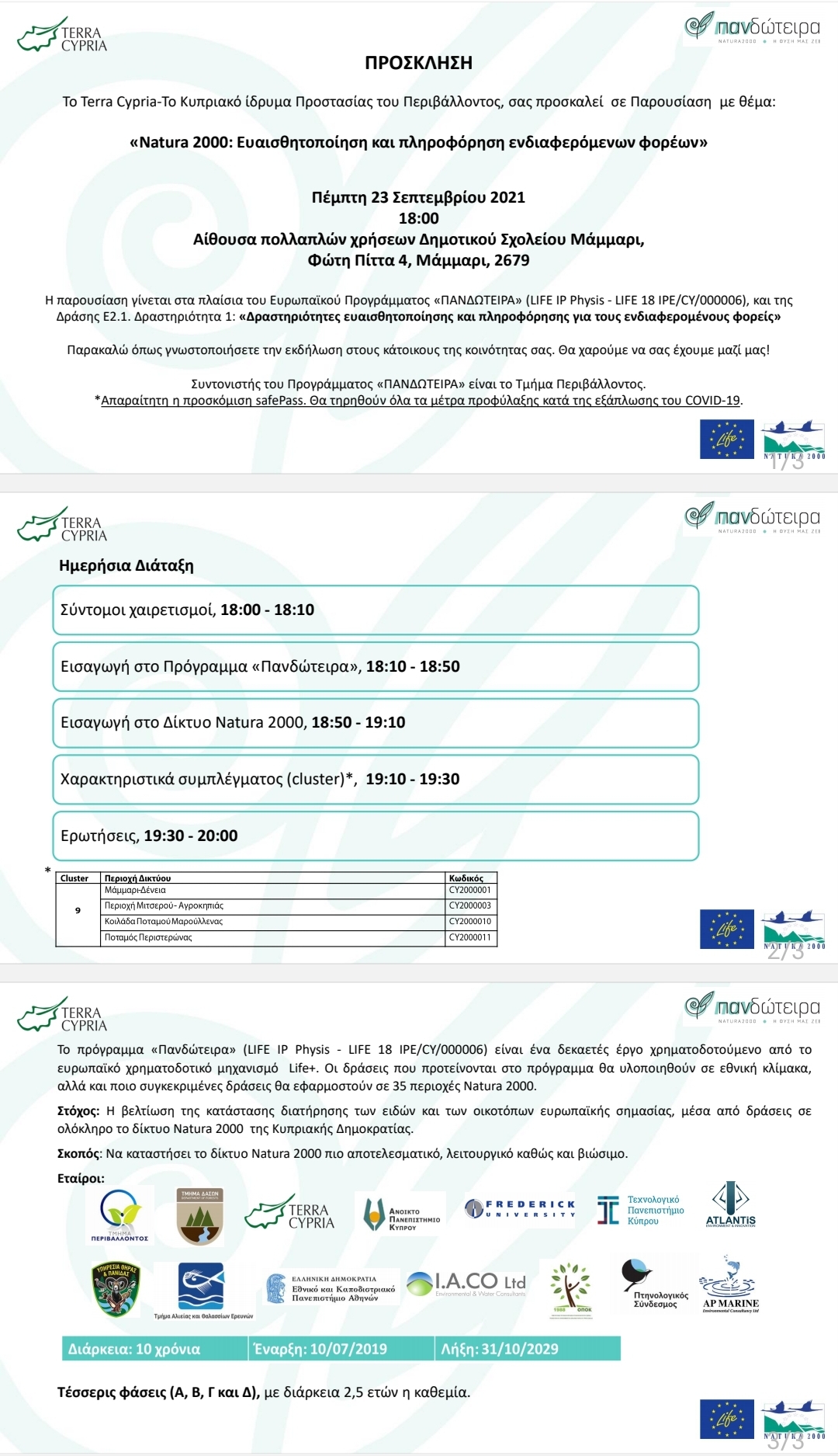 Σας προσκαλέσουμε σε παρουσίαση που διοργανώνεται στις 23 Σεπτεμβρίου 2021 η ώρα 18:00 στην Αίθουσα πολλαπλών χρήσεων Δημοτικού Σχολείου Μάμμαρι.