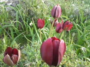 Πολυετές, βολβώδες φυτό με βλαστό ύψους 15-40 cm που καταλήγει σε ένα μεγάλο, σκούρο κόκκινο άνθος.